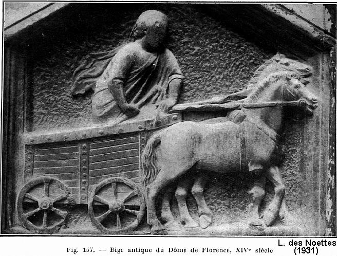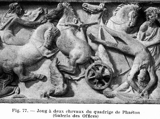 | LdN's Fig. 77, serious accident in a Roman chariot race showing details of a "Throat and Girth" harness. |